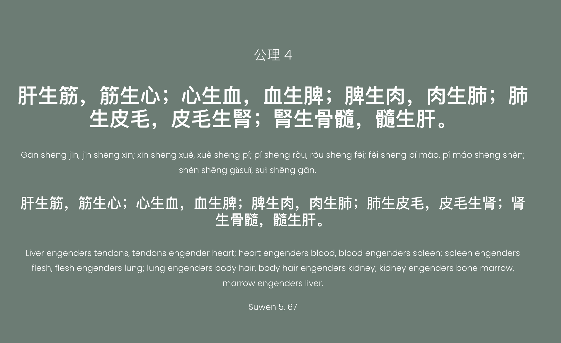 Liver engenders tendons, tendons engender heart; heart engenders blood, blood engenders spleen; spleen engenders flesh, flesh engenders lung; lung engenders body hair, body hair engenders kidney; kidney engenders bone marrow, marrow engenders liver.