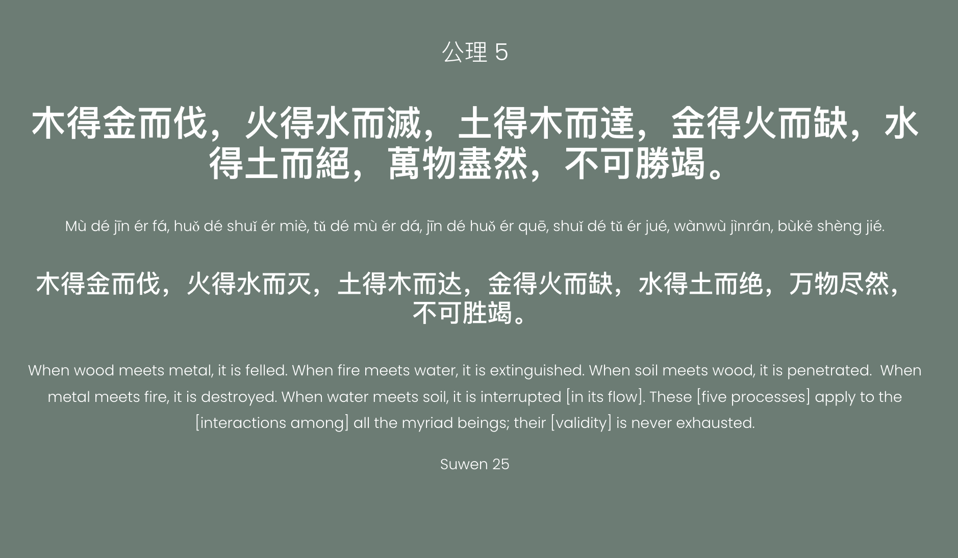 trad: 木得金而伐,火得水而滅,土得木而達,金得火而缺,水得土而絕,萬物盡然,不可勝竭。