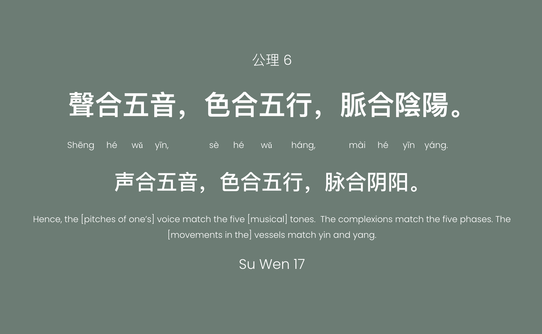 Hence, the [pitches of one’s] voice match the five [musical] tones. The complexions match the five phases. The [movements in the] vessels match yin and yang.